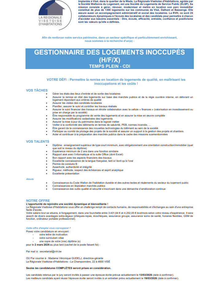 Gestionnaire des logements inoccupés (H/F/X) – Temps plein – CDI
